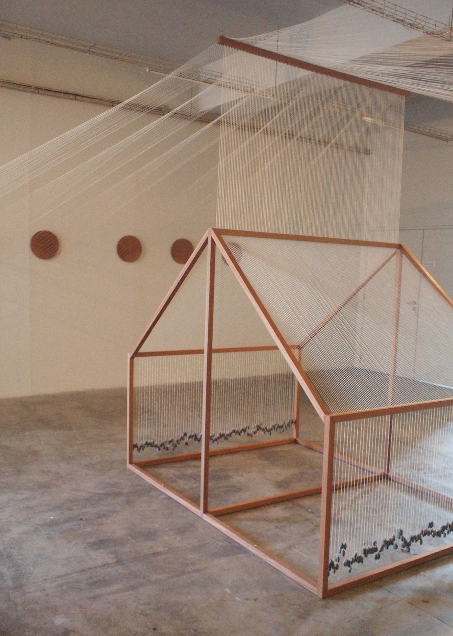 Into the historic interior, Rebelo inserts fragments of the original wooden floor from the Merina textile factory—a material saturated with traces of labor, movement, and passing years. These are complemented by her characteristic lines of threads and fibers, where a textile language meets drawing in space. The work unfolds directly on the floor and responds sensitively to the site—as if the space itself were a co-author.